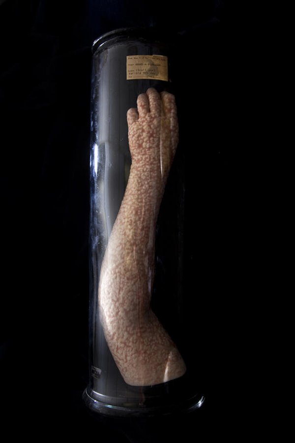 照片是一回事,但对于19世纪试图诊断疾病的医生来说,3D蜡模才是遵循的黄金准则。Mütter展示的蜡模有的表现的是皮肤癌、有的是天花、坏疽、麻疯病、荨麻疹等等。还有一个模型显示了手臂上的丹毒;还有的展示梅毒不同阶段的恐怖影响,这种病会侵蚀皮肤和骨头。