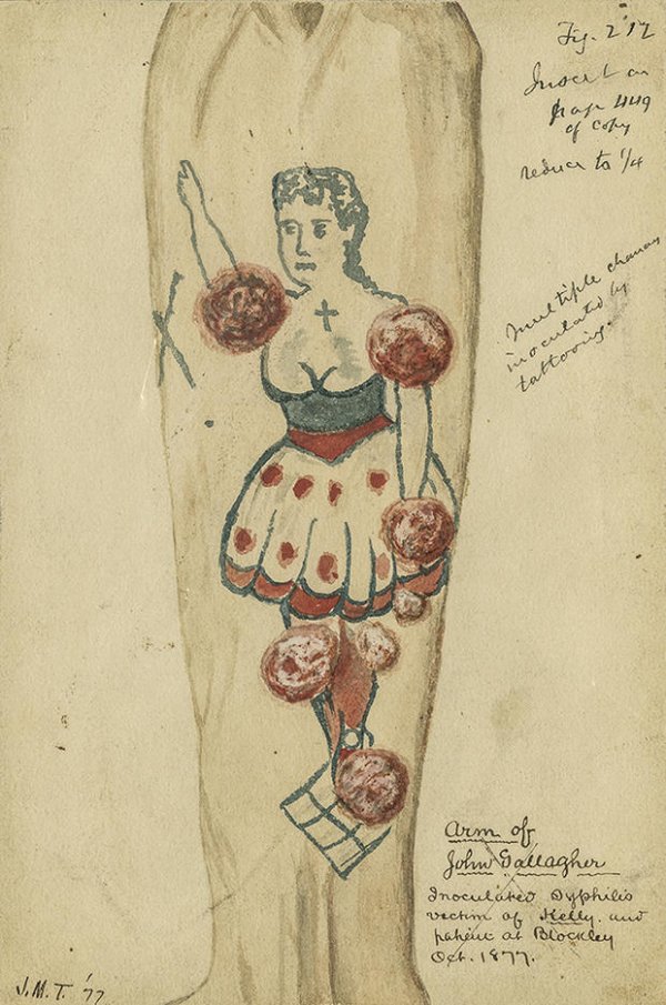 展示还包括几份纹身,描绘着宗教和爱国图案,不过也有一些出乎意料的图案,比如小丑和墓碑。虽然这些纹身皮肤样本确切的来源已不得而知,但都是宾夕法尼亚大学医学院的收藏。古老的墨迹可以让我们看出一些关于冰人奥兹的信息,它的身上有人类保存下来的最早的61处纹身,上面的水彩画画出了纹身后感染梅毒后的手臂。