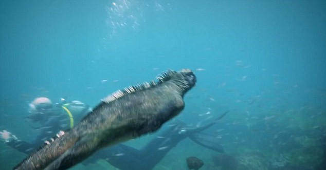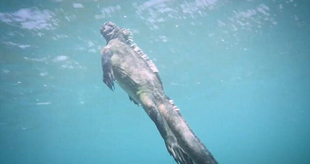 海鬣蜥从潜水员身旁游过。这头海鬣蜥当时正在寻找食物,可以看到它不断把嘴插到海床中的景象。海鬣蜥通过摆动尾巴游泳,姿势与人类非常相似。这段视频被上传到社交网络后已经在全球广泛转发,题目为“小哥斯拉在水下捕食”。