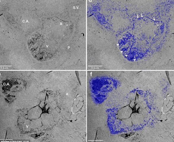 古生物学家于巴西发现了首例心脏化石样本,该化石存在于约1.13—1.19亿年前的棒鞘鱼(Rhacolepis)体内。 图为:团队使用无损成像技术,探视棒鞘鱼的体内结构。此次是首次在史前动物中发现心脏化石。之前研究者只发现过动物的骨头和足迹,因为生物体死后,软组织器官很快就会腐烂。