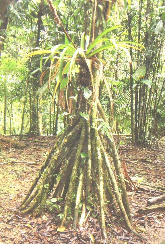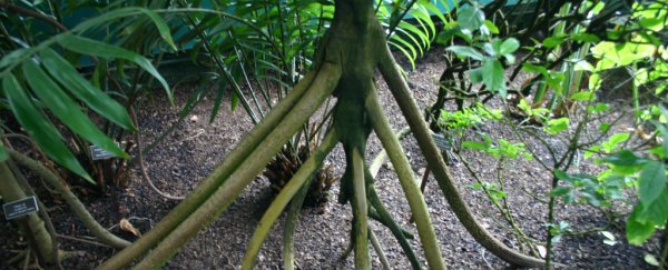 跟其他那些树根完全藏在地下的树木不同,行走的棕榈树有着悬空根系,从树干的下端开始分叉。它们看起来就像是一把扫帚。随着时间流逝和土壤的侵蚀,其中一些根就死掉了,新的根就长出来。