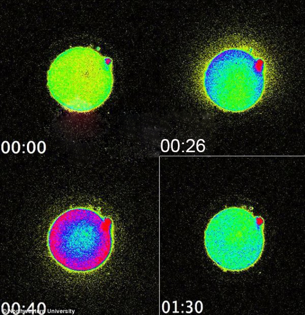 在此实验中,研究团队用一种精子酶刺激卵细胞(根据美国法律,出于研究目的而使精卵结合是非法的)。他们观察到卵细胞内部钙浓度的增加,促进了锌的释放。之后,锌会结合为小分子,并散发出荧光,被照相显微镜拍摄下来。