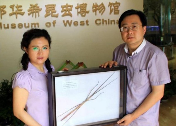 成都华希昆虫博物馆在一次赴广西野外科考中,发现了新的竹节虫物种,刷新了世界上已经被人类发现的807625种昆虫(2015年9月28日数据)中的最长纪录。这只巨型竹节虫足全长62.4公分,身体长度也达到36.1公分。