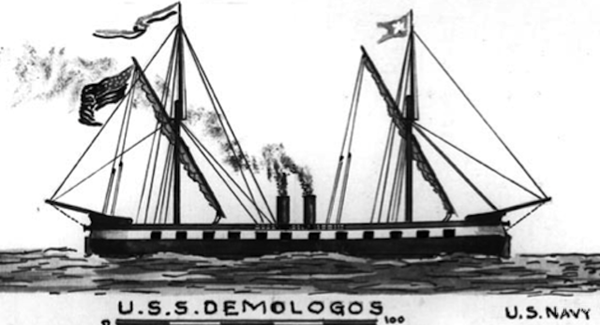 美国海军(the United States Navy)从1814年开始为USS Demologos设计第一艘由蒸汽推动的军舰。,著名的工程师和发明家罗伯特·富尔顿(Robert Fulton)假想了一艘与众不同的船:全副武装的船甲、双船体之间配置个船桨、引擎装在船体上而锅炉在另一个船体上。这样的船就像可移动的堡垒,非常适合防御和攻击(重2475吨,长48米)。