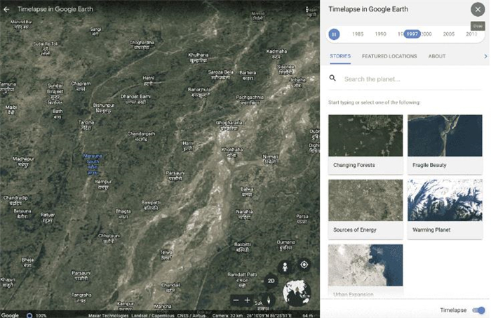 Google地球 (Google Earth) 最新推出的“缩时摄影”(Timelapse) 功能,可说是2017年以来最大规模更新,可透过2400万张卫星照片汇集影像来体验过去37年的地球变化,不仅能清晰观看迷人的自然现象,也能更了解这些年来地球经历的变化。
