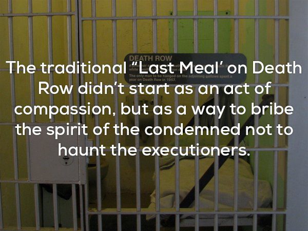 11. 死刑犯的“最后的一餐”并非出于对他们的同情,而是为了贿赂他们的灵魂,避免他们纠缠行刑者。