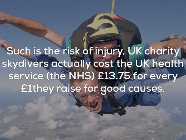 19. 由于风险非常高,英国从事慈善跳伞活动的人每贡献1英镑就会扣掉英国健保局13.75英镑的保费。
