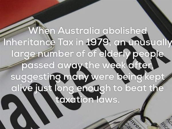 20. 澳洲在1979年废除继承税的一周后有大批老人死亡,显示了许多老人被家人维持住生命就只为了可以等到法律通过再死。