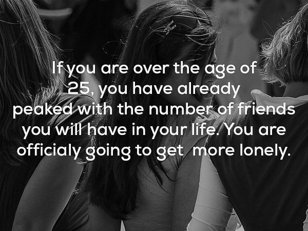 10. 如果你已经过了25岁,那表示你已经过了你一生当中拥有最多朋友的颠峰时期。你接下来只会越来越孤独。