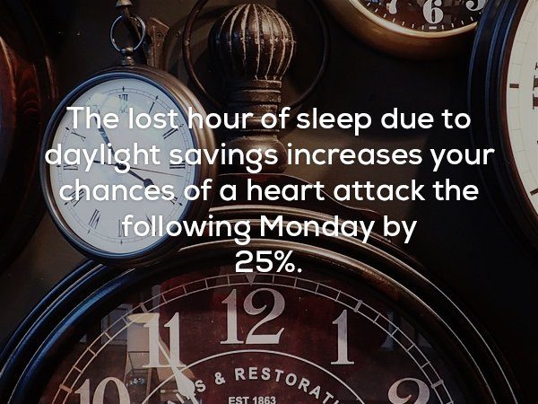 18. 节约能源日少掉的1小时睡眠时间,会使你下一个星期一心脏病发的机率提升25%。