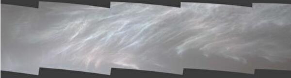 而由漫游车桅杆相机拍摄的彩色照片中,云的色彩很丰富。相机甚至还拍摄到了更漂亮的彩虹云或“珍珠母”云。
