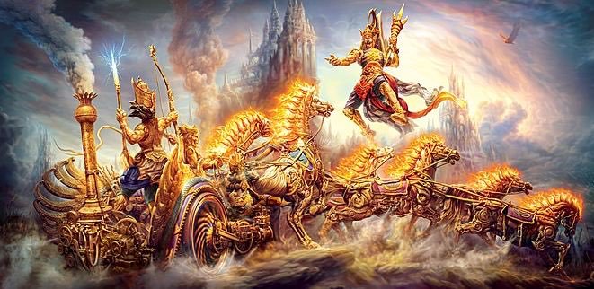新仇加上旧恨,一场大战终于爆发了,两派各自在印度次大陆上集结了盟友,通常站在般度族的会被视为“正法”,即正义一方,不过初期优势都在毗湿摩领军的俱卢族那,但自从阿周那用计使毗湿摩死在箭床上后,战况急转直下。