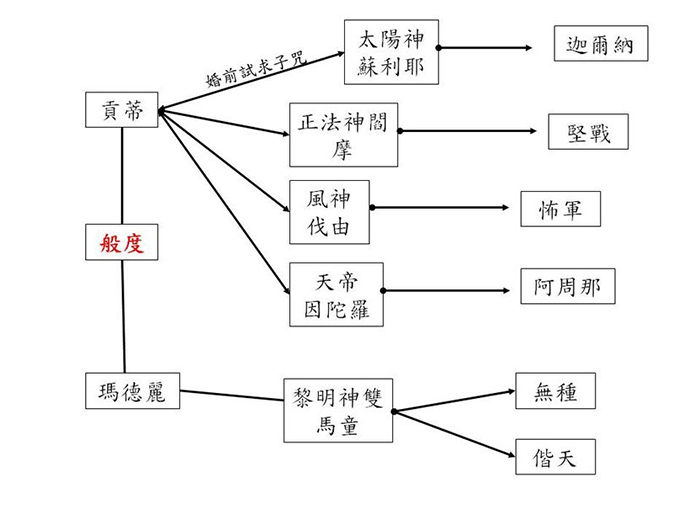 般度答应后,贡蒂召唤正法之神阎摩,生下了老大坚战,般度很高兴,要求贡蒂再多生几个孩子,于是贡蒂又召来风神伐由生下老二怖军,及与天帝因陀罗生下老三阿周那;玛德丽妒忌贡蒂有孩子,于是般度请求贡蒂把“求子咒”授予玛德丽,玛德丽召来了双马童神(双子神),生下了双胞胎无种与偕天。