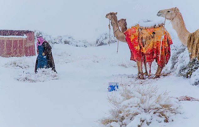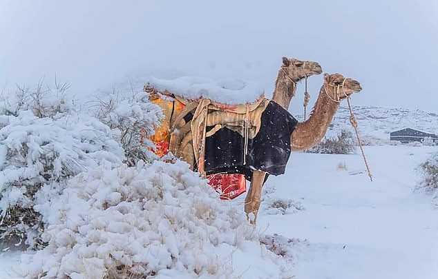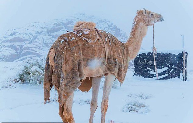 而这个地区上次气温低于冰点已经是50年前的事情了,你看看骆驼跟雪这两个超不合理的组合居然登场了。