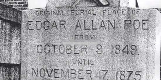 1849 年的时候,一个名为Edgar Allan Poe 的男子,在美国巴尔的摩被人发现倒在路旁,而他的状况很怪,感觉他异常兴奋而且有幻觉。被送到医院以后,他一下清醒一下休克,持续了四天之后,就死亡了。当时,在他清醒的时候,他自己也完全无法解释为什么会有这种状况。他过世之后,死亡原因被写为脑充血。不过,有关他的所有治疗记录与文件都离奇消失了,连他的死亡证明书都不见了。上面的图片是他的墓碑。