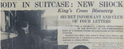 1934 年的时候,在英国的Brighton 车站,发现了一个行李箱,里面有一个年纪约20 几岁的女性躯干,她已经有三个月的身孕,而之后又在King’s Cross 火车站的行李箱发现她的四肢。警方在她的身上,发现一种油,而这个油是医师用来停止病人大量出血的油,因此大家都认为凶手一定有医疗背景。查了好几年,始终都查不出凶手,也查不出这名女性的身分。上面的图片是在King’s Cross 火车站再次发现有问题行李箱的新闻。