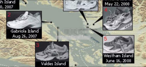 2007 年的时候,在加拿大温哥华沿岸,陆续发现好几个被冲上岸的脚。这些连着小腿骨的脚,都穿着袜子和球鞋。警方推测,这些脚应该是属于之前在Quadra 岛附近发生坠机意外的那些乘客,不过只出现脚和小腿骨也太奇怪了,所以警方还是继续朝谋杀案的方向去侦办,但目前都还找不到任何线索。上面的图片是每个穿鞋的脚出现的地点。