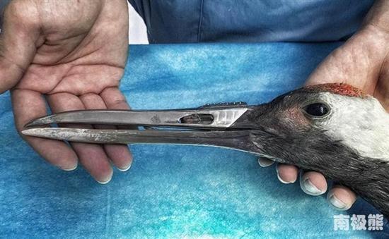 三周前,丹顶鹤“立立”在广州一动物园内打架,导致上喙几乎完全断裂,后来由于断裂端感染严重,上喙坏死。