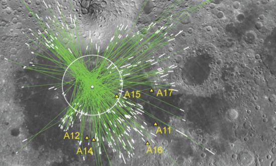 由雨海的沟槽等地貌描绘、撞击时散落的撞击天体碎块轨迹,其中一些朝向甚至是平行的,图中文字标注阿波罗六次任务的着陆点。