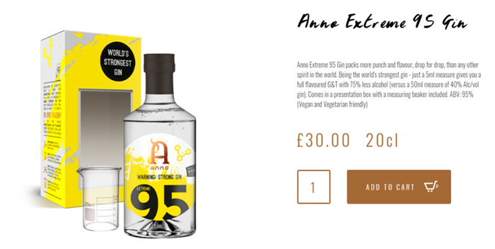 这间位于肯特郡的公司说:“这产品是由喜欢尝试冒险与试图突破极限的科学家完成,生产Anno Extreme 95 Gin的初衷是为了创造炼金术精神。”因为琴酒比其其他烈酒更带有强烈的风味,他们透过浸泡过和蒸过植物药混和并经过长时间的蒸馏,来创造更强烈的味道,并装进20毫升的罐子里。