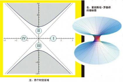 在研究爱因斯坦方程的过程中,物理学家发现除了时空中存在黑洞以外,还必须存在白洞。而白洞正好是黑洞的时间反演,里面的任何物质都会向外运动,穿过它的边界(也称为事件视界)之后就再也无法回到内部。除了黑洞和白洞这两个时空区域,还得有另外两个彼此完全隔离的时空区域,称为两个不同的“宇宙”。这两个宇宙与黑洞和白洞的关系如下:白洞中的任何粒子和信号都可以进人这两个宇宙,但都无法返回到白洞里;两个宇宙中的任何粒子和信号都可以进入黑洞,但都无法在从黑洞中逃离,只能撞上黑洞内的奇点上;两个宇宙彼此完全隔离,也就是它们之间没有任何信息可以交流。所有四个区域可以由下左的时空图来表示。