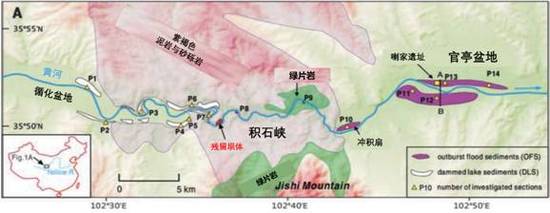 通过对滑坡崩积坝的模拟重建,科学家认为堰塞湖最终会没过坝顶,并迅速形成溃坝洪水。他们在积石峡的下游找到了证据:以大量前寒武系绿片岩、紫褐色白垩系沉积岩的碎片为特征的溃坝洪水沉积物(OFS),这些本属于积石峡地区的岩石,被湍急的洪水带到了远至25公里外的官亭盆地,沉积在高于水面7~50米的河滩上。