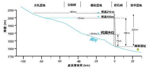由于上游的特殊盆地地势,这道滑坡坝可将黄河水拦住6~9个月,并形成蓄水12~17立方千米的巨型堰塞湖。在对残坝上游的勘探过程中,地质学家发现了大范围的、堆积厚度达30米的堰塞湖特质沉积物(DLS),证实了上游地带曾经存在过如此规模的堰塞湖。