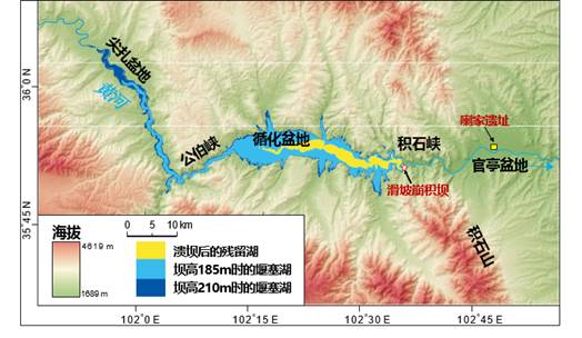 位于青海省循化县境内的积石峡,是黄河上游最重要的峡谷之一,全长约23公里、深度达1000米,地势十分险峻。积石峡区域在古代曾发生过一次山体崩塌,滑落的土石拦住了黄河,形成了一处堰塞湖。根据现在残存的坝体,作者计算出当时的滑坡坝纵深1.3公里、高于古黄河河道185~210米(深度堪比三峡)。