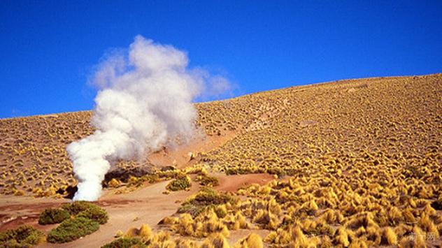 在智利北部高于阿塔卡玛沙漠的地方,许许多多的间歇性喷泉构成了地球上最具西域风情的景致,因为这里海拔高达13800英尺,所以水的沸点只有186.8华氏度。喷泉喷出的水是整片区域唯一的水源,环绕地热谷间歇喷泉的山川海拔要再高5580英尺,使这片地域又增添了几分神秘,泉水流经的狭窄河道里长满了耐高温的水藻和苔菌,使河道有了彩虹般五彩缤纷的色泽。