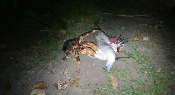 根据《每日邮报》报道,美国达特茅斯学院(Dartmouth College)研究员莱德尔(Mark Laidre)前往印度洋的查戈斯群岛(Chagos Archipelago)进行研究,目击到晚上一只椰子蟹,爬到鸟群的巢穴,捕捉到一只海鸟,然后它的大螯就宛如狮子的下颚一般,钳住海鸟的身体,翅膀甚至因此被折断,失去飞行能力。