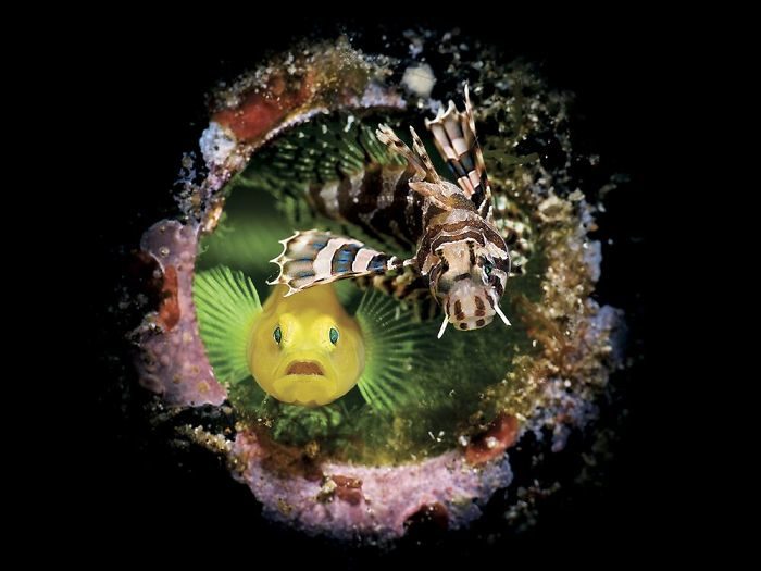 在菲律宾潜水时,我看到了一个空的啤酒瓶,但里面有东西,是柠檬虾虎鱼。几秒钟后,看到一只幼小的狮子鱼跑出来抢镜头。