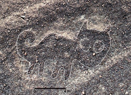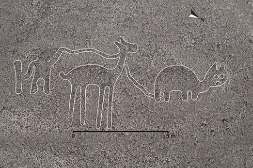 像是其中一幅位于秘鲁纳斯卡线左侧的地画,从空拍画面就能依稀看出头发、五官、四肢及胸部的轮廓,似乎是一名裸体女性的画像;另外一幅地画绘制了长长的尾巴及竖起的耳朵,明显能看出猫咪的模样。