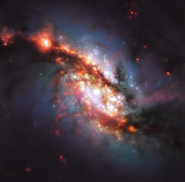 MUSE是多单位光谱探测器(Multi-Unit Spectroscopic Explorer)的缩写,它使用光学和红外光望远镜拍摄了这幅图像,展示了星系中央的气体和尘埃。该仪器安装在四台超大型8.2米望远镜之一的Yepun望远镜上,它使我们能够对宇宙进行一些迄今为止最全面和详细的研究,包括对遥远星系、超大质量黑洞甚至引力波源的调查。