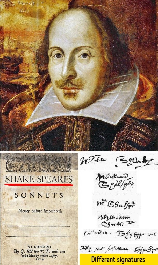 莎士比亚从来没写过任何著作,作者可能是不同的人:莎士比亚是在一个绵羊贸易中心出生和长大的,正常来说,他根本无法获得足够的知识来写出关于政治,法庭阴谋和其他国家文化的作品。此外,作品上也没有莎士比亚独创的签名,每个作品签名的样式都不一样,有写Shakespeare、Shake-speare甚至是Shak-spear.。