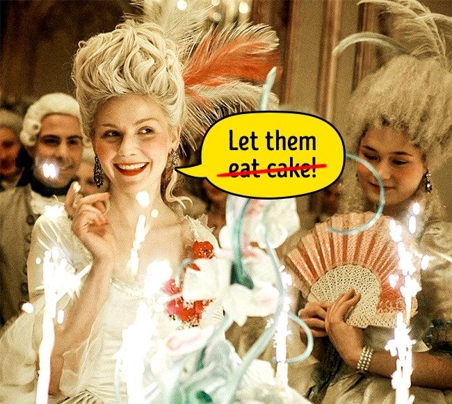 玛丽亚安东尼特(Marie-Antoinette)皇后没有叫人民吃蛋糕:当时法国面临饥荒,大臣告知玛丽亚“百姓无面包而饿死。”她说:“何不吃蛋糕?”这句话是由Jean-Jacques Rousseau首先写下的,据说是一些君主说的,但玛丽亚并没说过这句话,因为她才9岁,而且还住在奥地利。另一说法,她的确说过,但没有蔑视的意思,因为当时的法律规定面包师要在危难时把价格昂贵的面包降价,也许这才是本意。