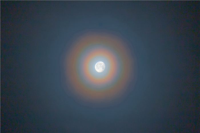 据了解,华(Corona)是一种自然光源透过薄云中的微细水滴所而产生的特殊光像。在太阳周遭形成一圈彩虹光环即为日华(Solar Corona);而在月亮旁绕成一圈的彩虹光环即为月华(Lunar Corona)。因为月华形成条件是需要薄云层,所以特别在月圆、多云的夜晚更容易看到,不过有时彩虹圈不太明显。