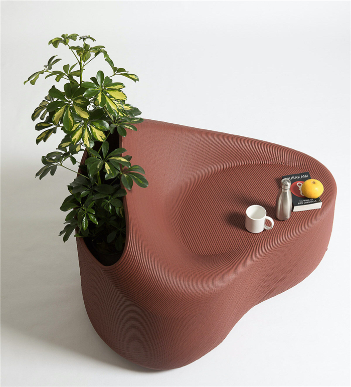 该项目的Pots Plus系列最初与欧洲城市官员合作,并响应城市的生活方式,利用再生材料通过3D打印出来的作品包括人体工学凳子、自行车架、健身设施、植物花盆、宠物喂食碗或书柜等。每件作品都有一个金属标签,标示着制作它所使用的塑料公斤数。