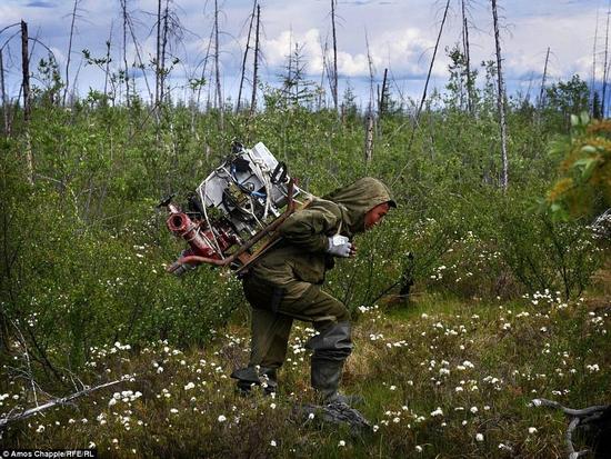 来自新西兰的摄影师Chapple通过“贿赂”才得以潜入猎人内部,在和他们相处的3周里,Chapple只能负责一些类似砍柴的初级工作。据Chapple透露,由于环境艰险,猎人们通常会随身携带手枪或者火枪,以防野兽出没。图为猎人背着工具箱,他们主要使用高压水枪来搜索遗骸,水枪由某种烟雾发电装置供电。