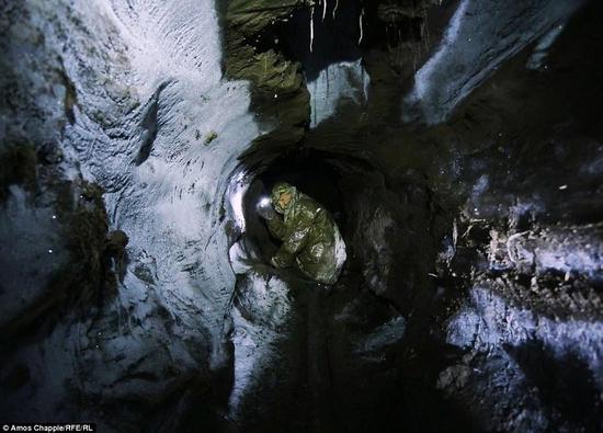 由于常年挖掘,这里的河流已经被严重污染,河水几乎呈巧克力色。图为一位猎人在隧道里攀爬,整个地下隧道约有60米长。