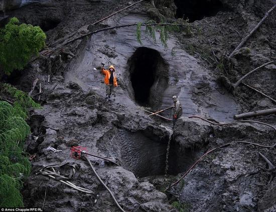 图为猎人使用高压水枪在山洞外寻找猛犸象遗骸,这种操作方式对当地生态造成严重破坏。