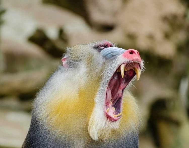 狒狒:狒狒独特的彩色面孔犹如一个小丑,但当它张开嘴就不会引人发笑了,它长着较长的犬齿,甚至还能吓退豹子。狒狒的牙齿起到恐吓的作用,但是如果入侵者过于接近时,它们会向前撕咬对象。