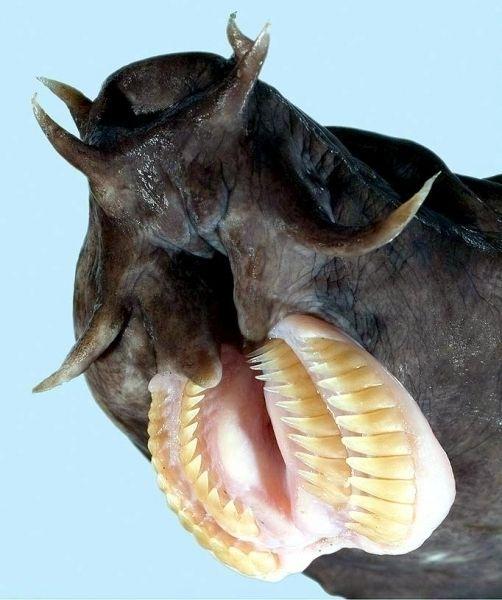 吸血鬼鱼:当你看到这种鱼的牙齿,你就会明白为什么人们将它与吸血鬼联系在一起,这种鱼下唇延伸的尖齿很长,大约15.24厘米,它的头骨结构较为特殊,可以避免尖齿将自己刺穿。