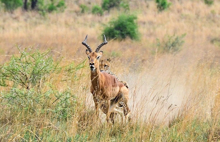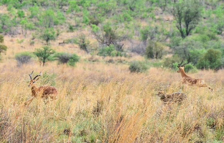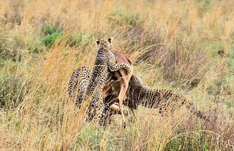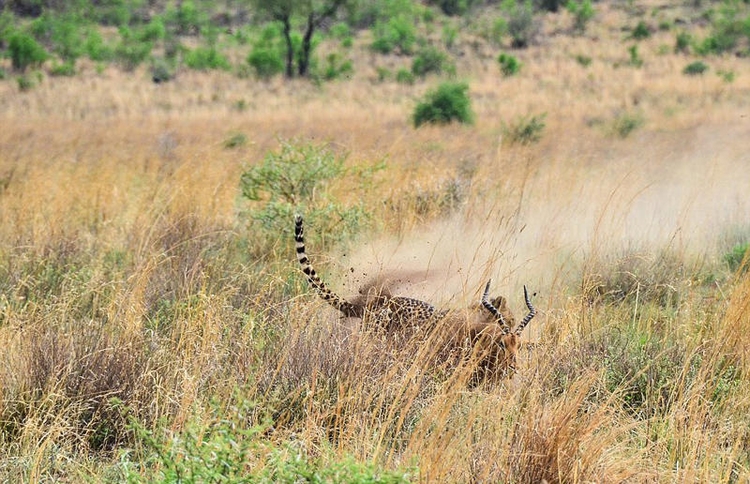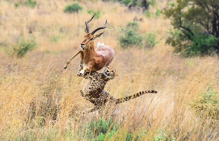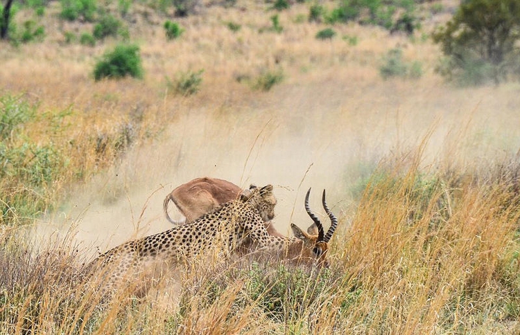 野外向导五十度灰格•艾斯特哈吉森(Greg Esterhuysen)在南非匹兰斯堡国家公园(Pilanesberg National Park)用相机抓拍到戏剧性的一幕:一只猎豹瞄准一只黑斑羚后,急速冲刺过去。它扑到黑斑羚背上,将其拖倒在地,为幼崽捕获了一顿丰盛的晚餐。