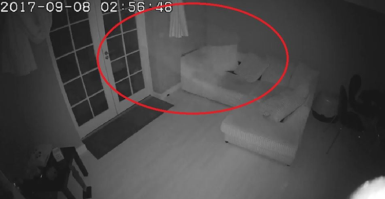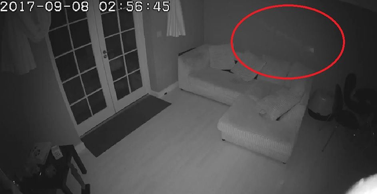 屋主的监视器画面显示家里的客厅晚上出现一个“幽灵”飘进来然后消失在空气中。