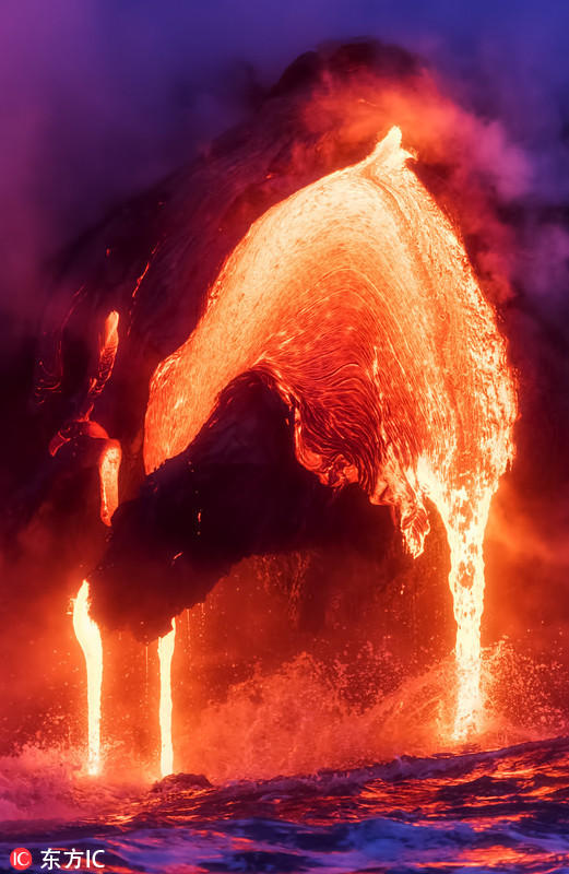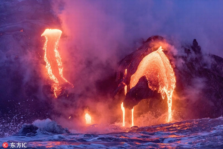2016年10月10日报道,摄影师成功捕捉到一大真实的世界奇观—同时拍摄到岩浆流、银河、明月和流星景象。摄影师Mike Mezeul在夏威夷岛的火山国家公园拍摄到了这一自然美景的完美组合。画面中,火红的岩浆流与紫色蓝色的夜空形成了鲜明的对比,构成完美景象。更有火红岩浆注入大海中,与海水亲密触碰,创造出滚滚蒸汽,如同大自然的锻造厂,令人震撼。