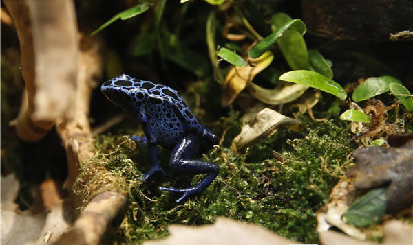 这是10月14日在比利时首都布鲁塞尔自然科学博物馆拍摄的天蓝丛蛙,又名钴蓝箭毒蛙,原产于南美洲的苏里南。
