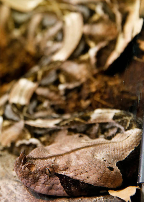 这是10月14日在比利时首都布鲁塞尔自然科学博物馆拍摄的加蓬咝蝰,加蓬咝蝰分布在非洲撒哈拉沙漠以南的热带雨林地区,是世界上毒性最强的蛇类动物之一。