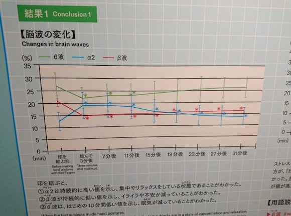 日本三重大学医学院用了两种方法证明这项说法,第一个方法是让15名民众做出结印后,测量他的脑波与心跳,而参与者在做完结印手势后的3~30分钟期间,测量到α2脑波有明显上升的趋势,这意指他们的注意力不但提高了,还一直处于放松的状态;另一方面,他们的β脑波也下降了,这意指不安与烦恼随之降低,这种趋势维持了30分钟之久;最后代表深度放松的θ脑波也下降了,维持了将近10分钟的低趋势后逐渐回升,这指出忍者结印法对可能有能立即让人获得休息的功能。