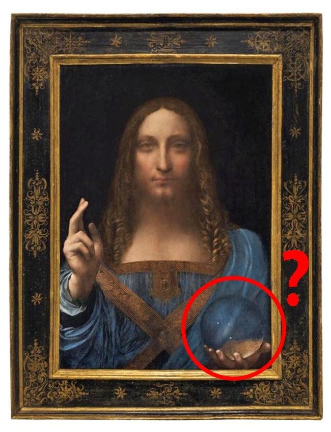 如果你仔细看这幅画,就会发现耶稣手中的水晶球是半透明的,但达芬奇不只是画家也是位博学家,对于物理、天体、光学都有深入研究,他应该知道透明水晶球不是这样的呈现方法,,照理说光线穿过水晶时会产生影像被扭曲的情况,因此水晶球的背景应该是放大、出现折射现象。有物理学家认为这是小错误,也有人认为达芬奇可能是不想要看画的人分心,或想借此表达耶稣拥有神奇力量。