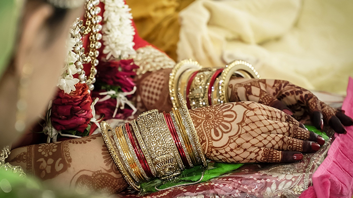 掀开新娘房门外的纱帘,会看见新娘已穿好颜色鲜艳的纱丽,手上画好象征吉祥的彩绘,抹上气味浓烈的香水或香膏,全身再被贵气的珠宝装扮。保姆的女儿或是闺蜜正排坐在她的两旁,吹捧新娘的美貌,让新娘以为自己是世上最幸福的人。
